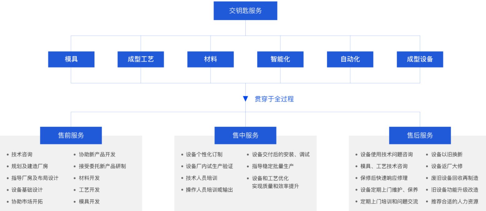 近年來,三基在掌握壓力鑄造裝備研制的核心技術(shù)并不斷豐富工藝應(yīng)用案例的同時(shí),基于同客戶的實(shí)際合作經(jīng)歷、從客戶角度出發(fā),逐步打造出了以為客戶增值為產(chǎn)品定位的三基‘服務(wù)型產(chǎn)品’。我們秉承“工業(yè)大服務(wù)”理念,依托三基省級工程技術(shù)研究中心及中試車間,將擠壓鑄造(液態(tài)模鍛)的工藝優(yōu)勢最大化地應(yīng)用拓展,提供交鑰匙形式的(Turnkey Service)‘服務(wù)型產(chǎn)品’- 涵蓋成型裝備、原材料、工藝、模具、自動(dòng)化、供應(yīng)鏈、智能化等多維度。